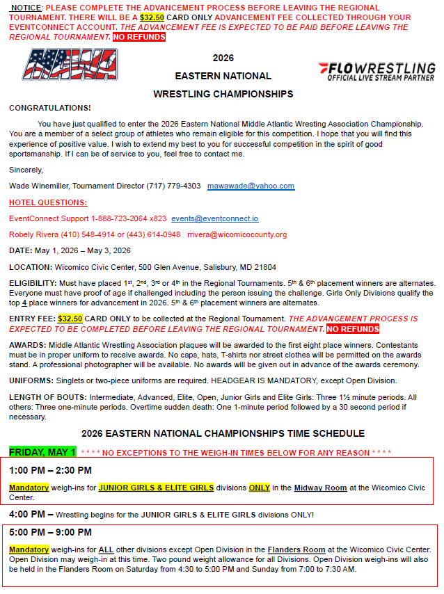 2026 MAWA Eastern Nationals Wicomico Civic Center 500 Glen Avenue Salisbury, MD 21804 |